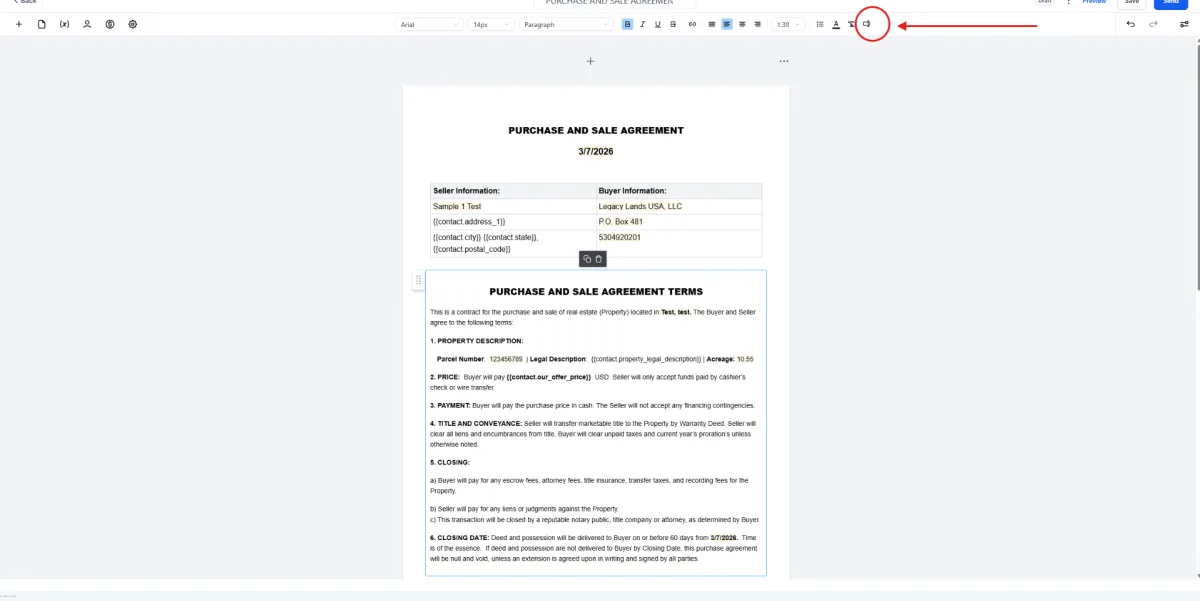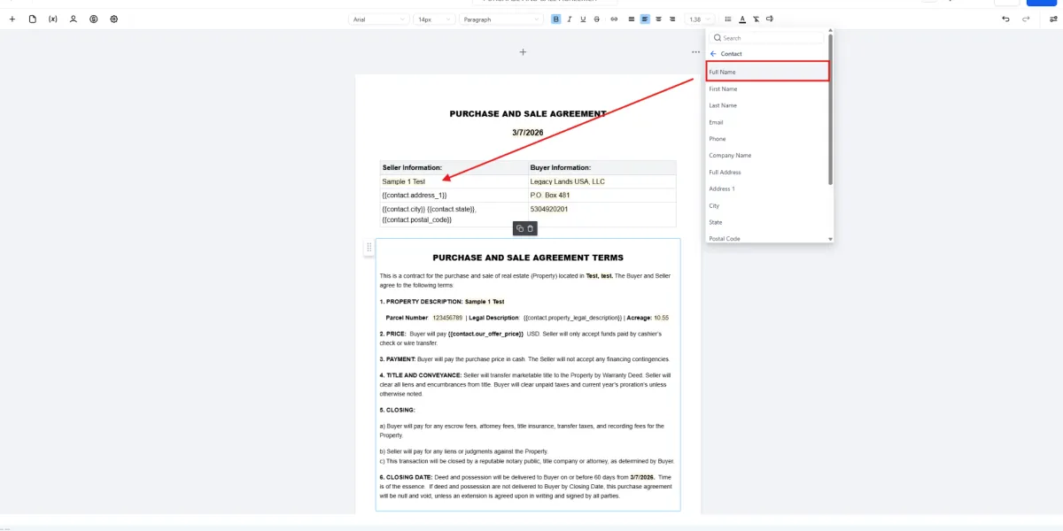 Your document will automatically populate the selected fields using CRM data, allowing you to create dynamic and reusable contract templates without manually entering client information each time.