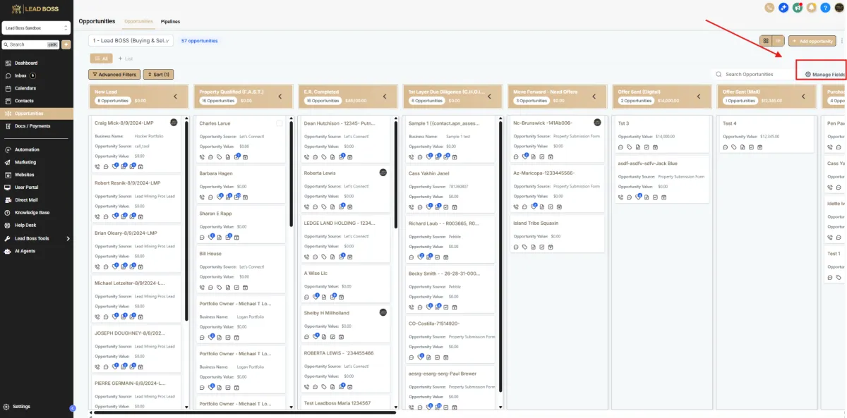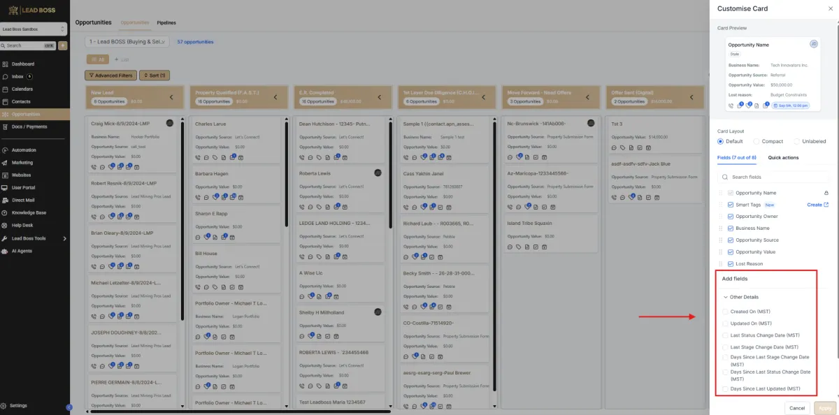 You can customize the Opportunity Cards in the pipeline to display important information such as APN, County, Lot Size, or other custom fields. This helps you quickly see key details without opening each opportunity.