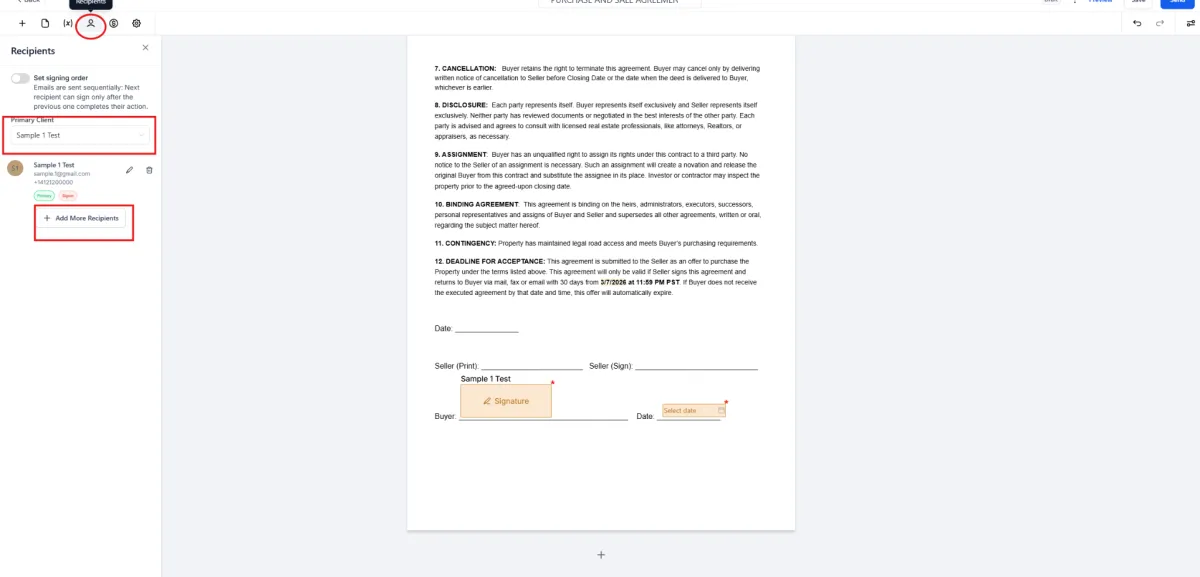 3️⃣ If needed, click Add More Recipients to include additional signers.