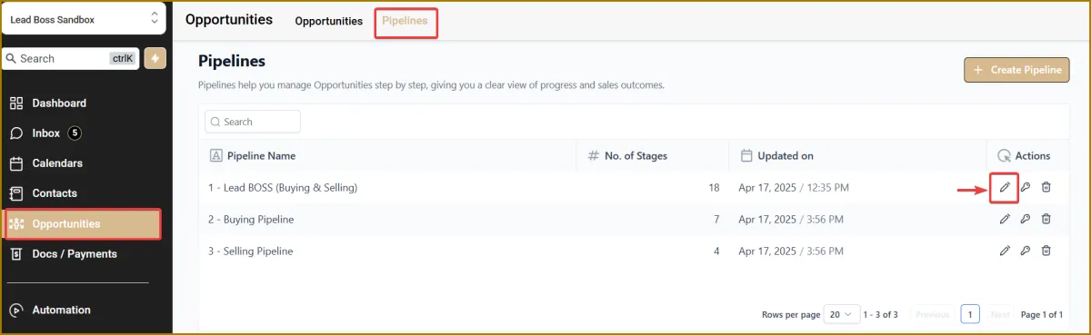 🔹 The Edit (pen) icon next to each pipeline name allows you to rename the pipeline or modify it even after it has been saved.