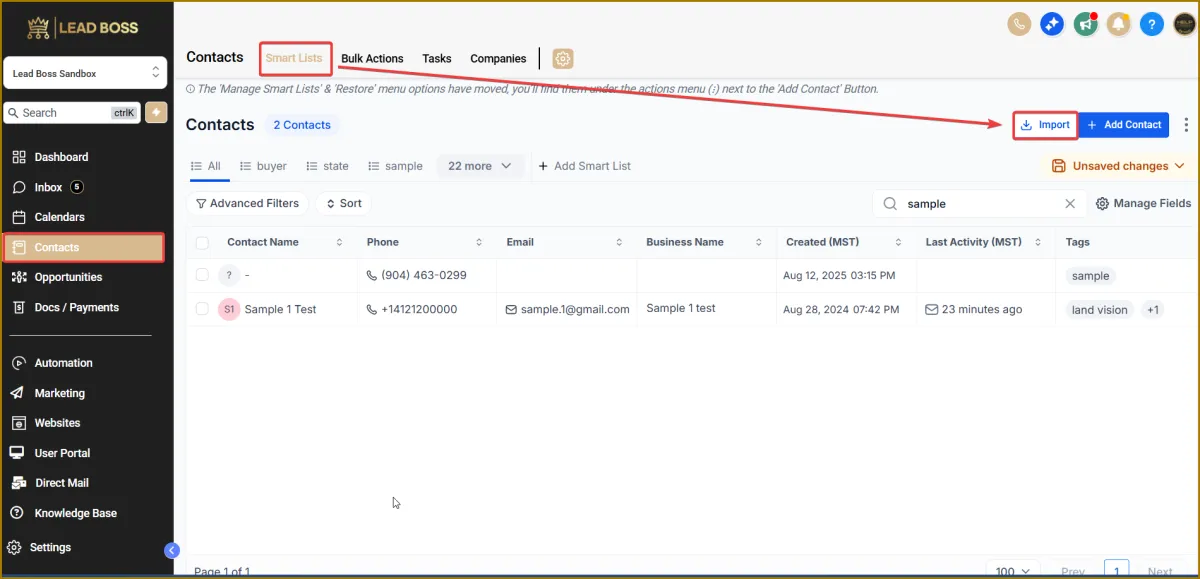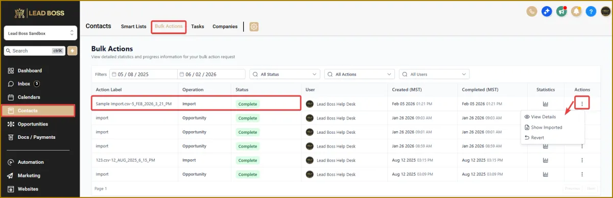 4️⃣ To view contacts from a specific import, click the three-dot menu next to that import and select Show Imported.