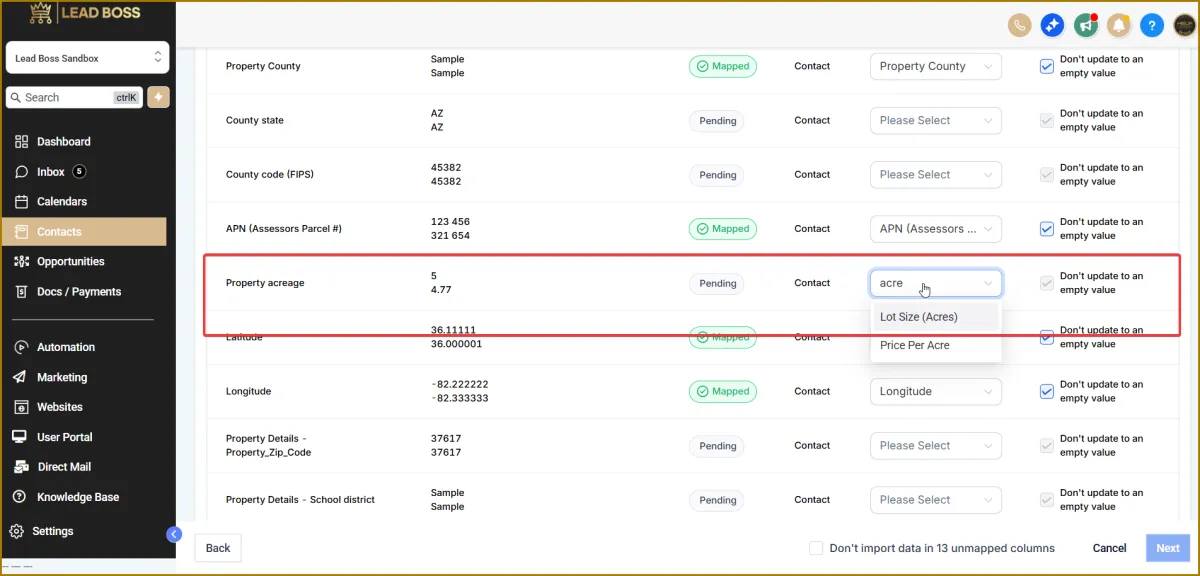 If your CSV column header is labeled “Property County” and a field with the same name exists in Lead Boss CRM, the system will automatically recognize and map it.
