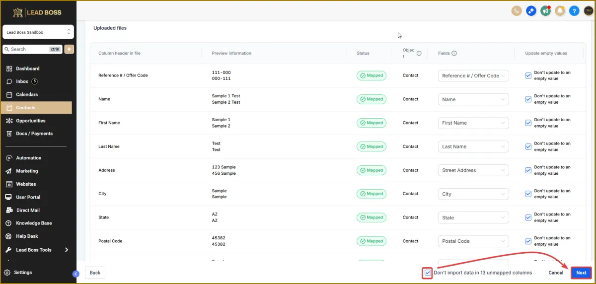 🔹 Match each column in your CSV file to the corresponding field in Lead Boss CRM.