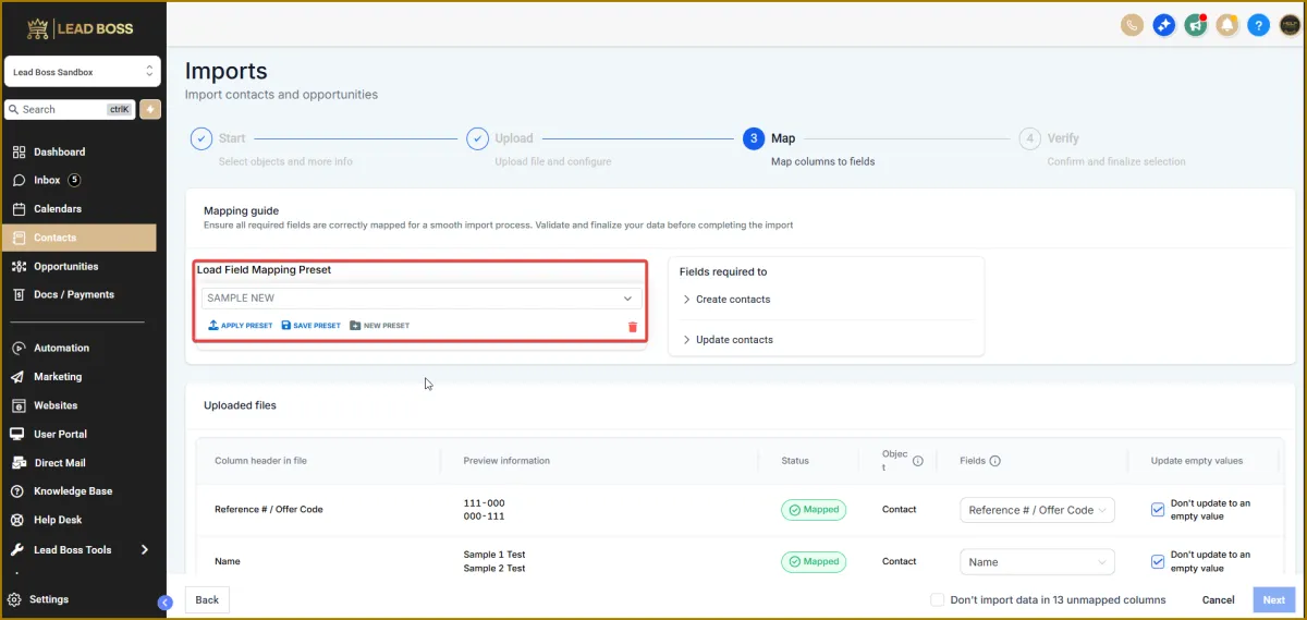 🔹 Presets allow the system to remember how your fields are mapped so you can reuse the same configuration for future imports.