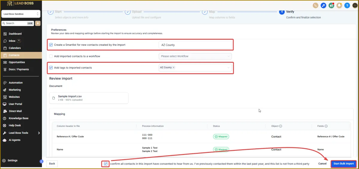 1️⃣ Confirm that all contacts in this import have given consent to be contacted by checking the confirmation box.