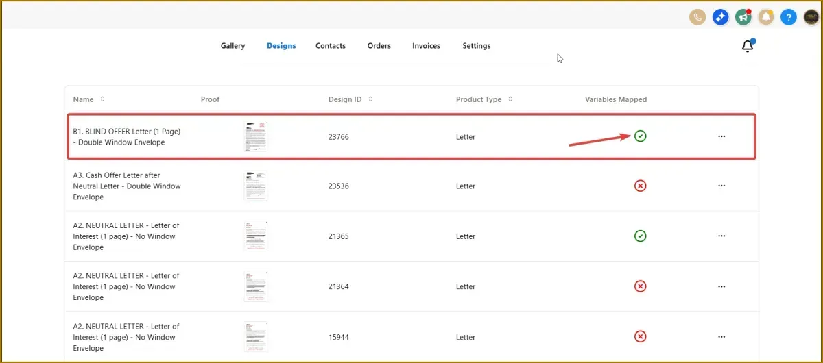 If the mapping was completed successfully, a checkmark icon will appear next to the design.