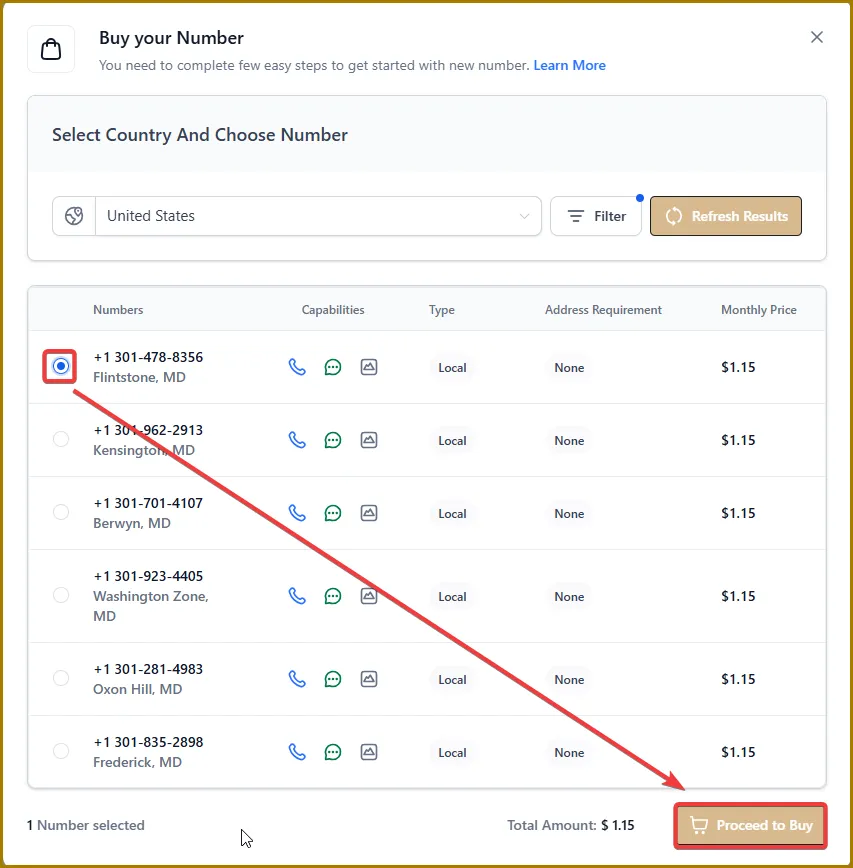 Select the phone number you want, then tap Proceed to Buy.