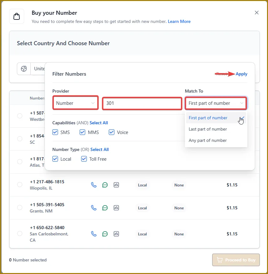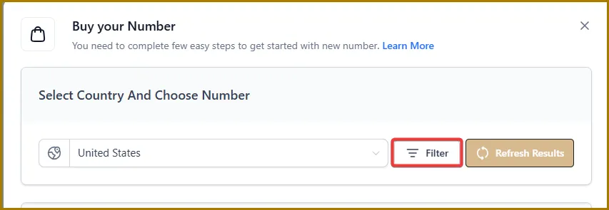 4️⃣ After you tap Filter, you’ll be prompted to choose the area code you want.