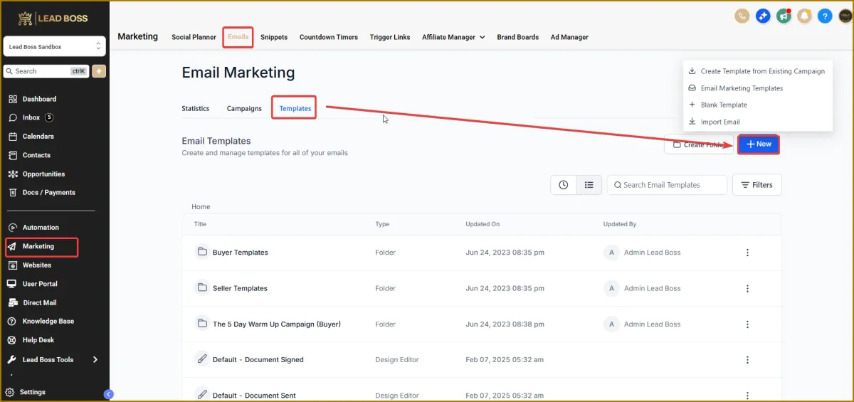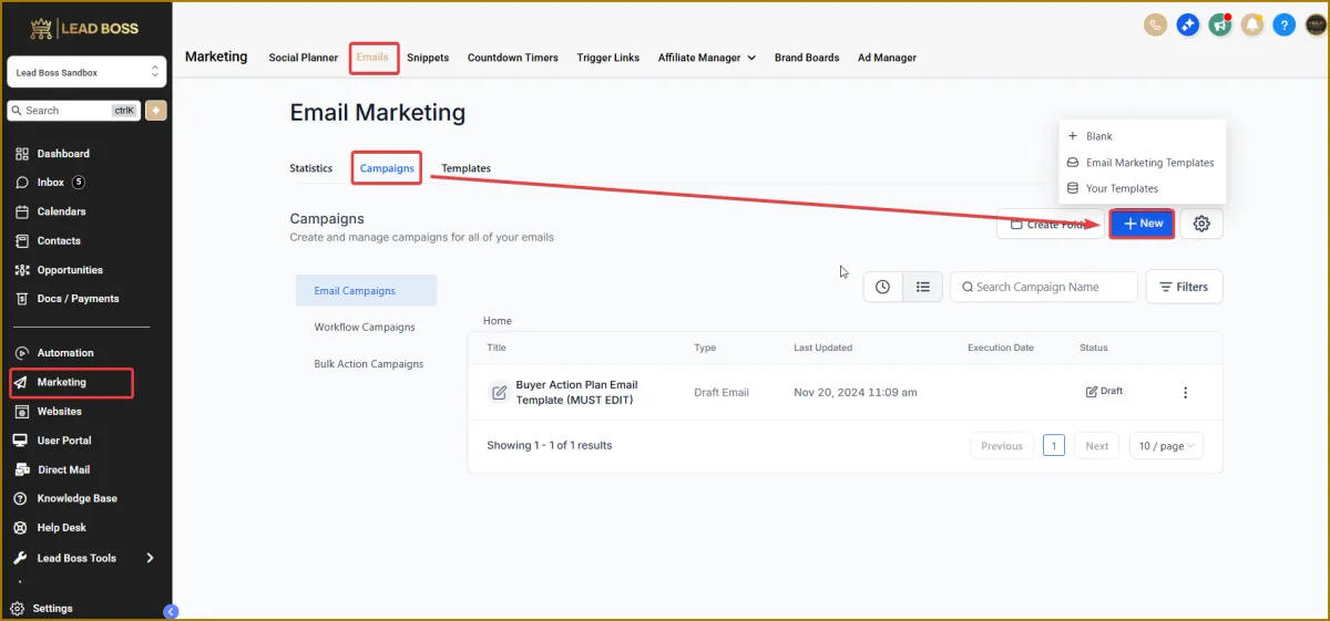 The Email Marketing section has two main areas: Email Templates and Email Campaigns.