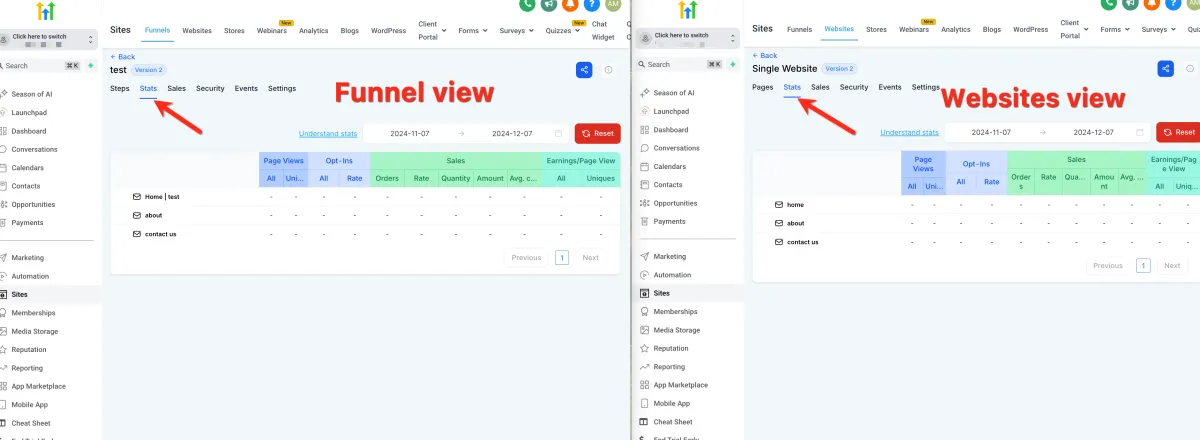 1️⃣ Navigate to your Site or Funnel dashboard.